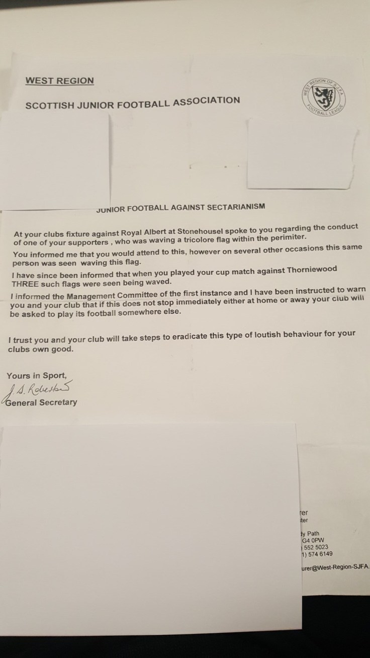 According to the letter grandly titled “Junior Football Against Sectarianism” produced by General Secretary J Scott Robertson, St Roch’s were threatened with expulsion from the league for the flying of Irish flags in 2015. A situation he’d attended to personally. When asked about this St Roch’s responded only that the matter was resolved amicably and they were satisfied with the outcome.