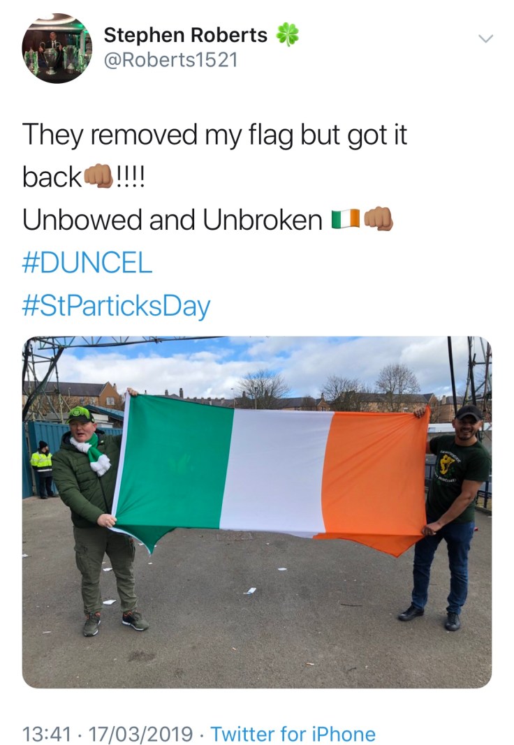 Two events that came to my attention since then have changed my mind however, though this remains not entirely unrelated. While watching the Dundee vs Celtic match at the weekend there was an incident (now widely shared) where a steward confiscates an Irish tricolour flag from above an exit in the Celtic section, followed by its owner jumping down after it seconds later.
