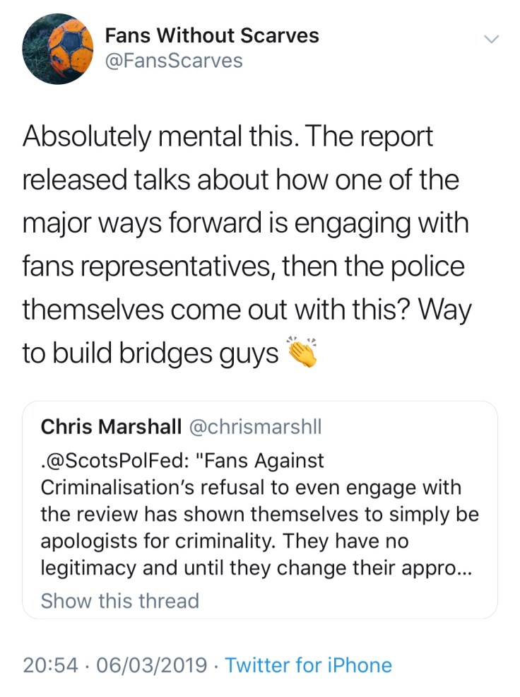 It is high time that the police engaged properly with fans representatives – and by that I’d recommend Scottish Football Supporters Association (@ScottishFSA) rather than the SFA’s puppet organisation, Supporters Direct Scotland. They have more engaged and signed up fans despite being entirely voluntary (SD is SFA sponsored) and provide an independent cross section of all supporters. They represent real fans wanting better representation without the SFA’s thumb pinning them down. Amanda Jacks (@FSF_FairCop) at FSF also does some fantastic work to help reconcile in this area and would be a welcome addition to any such conversation.
